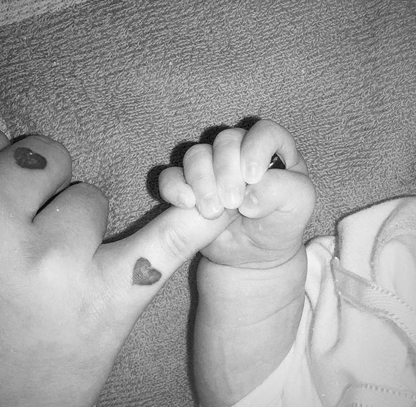 赤ちゃんの小さな手と、ハートマークのタトゥーが印象的ですね