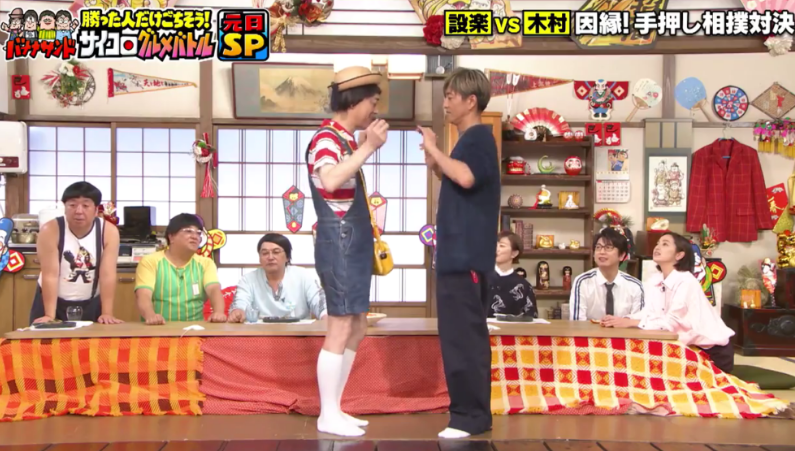 今回木村さんの身長が176㎝あると決定づけられた根拠でもある、バナナサンドにてお互い靴下の状態で手押し相撲をしている様子になります。
