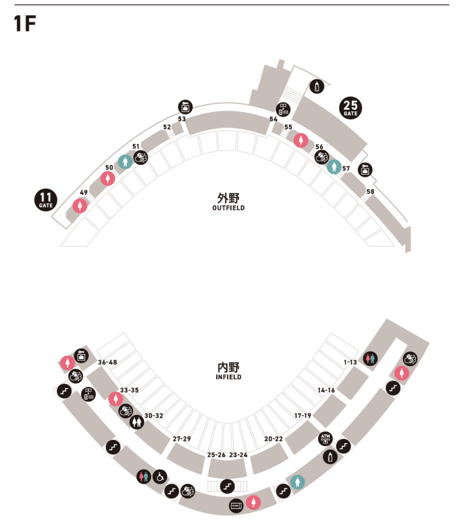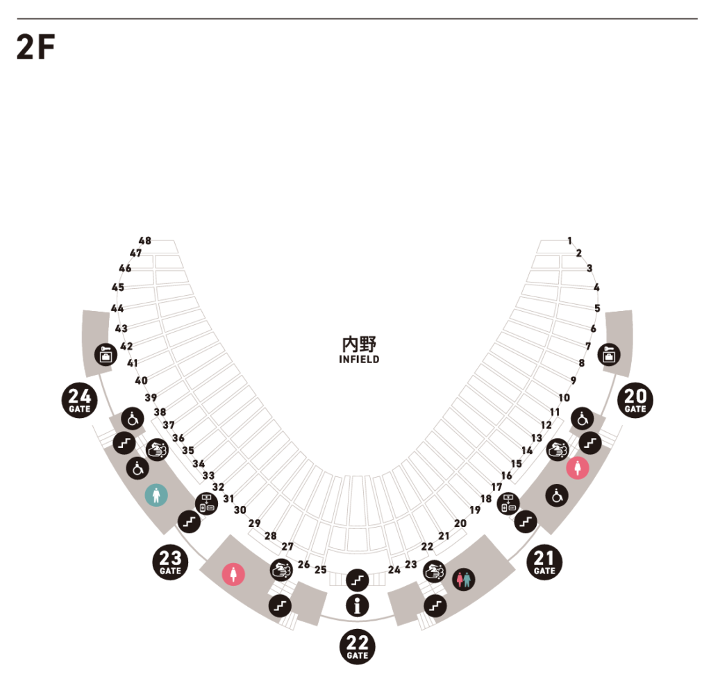- 内野1階・2階の20〜24ゲート周辺が最混雑エリアなので、開演1時間前〜30分前と終演直後の利用はできるだけ避ける。