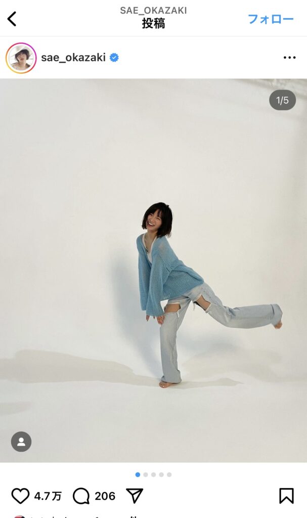 その後岡崎さんがSNSに投稿した自身の写真で着用していたデニムと上に着用していたニットも似ていました。