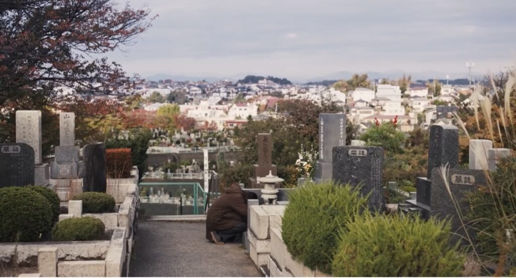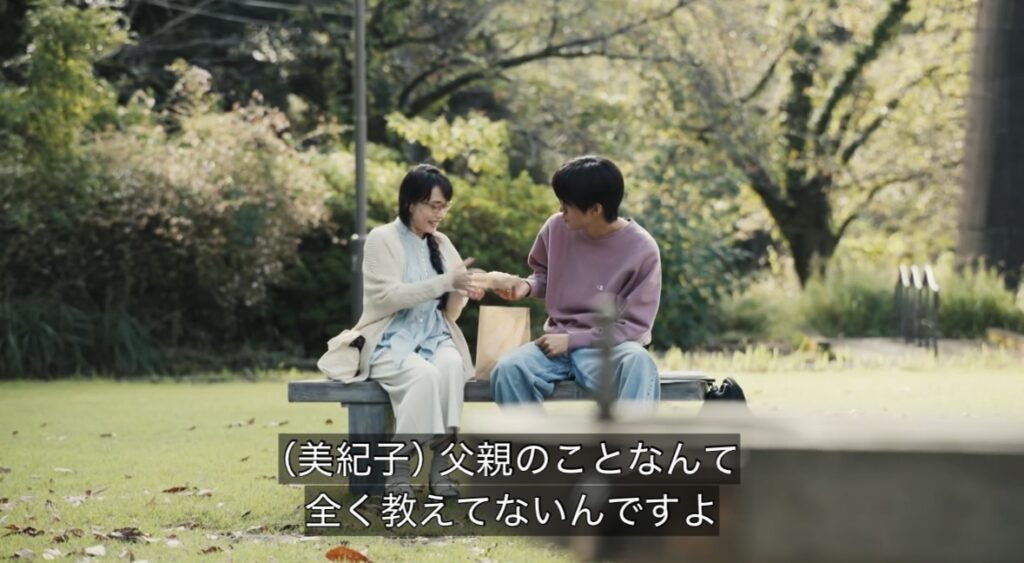 病院内の芝生:中条美紀子とハンバーガーを食べるシーン