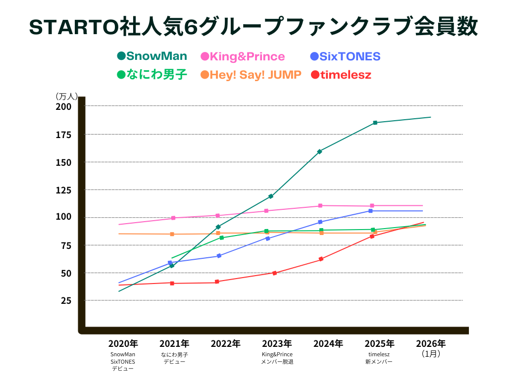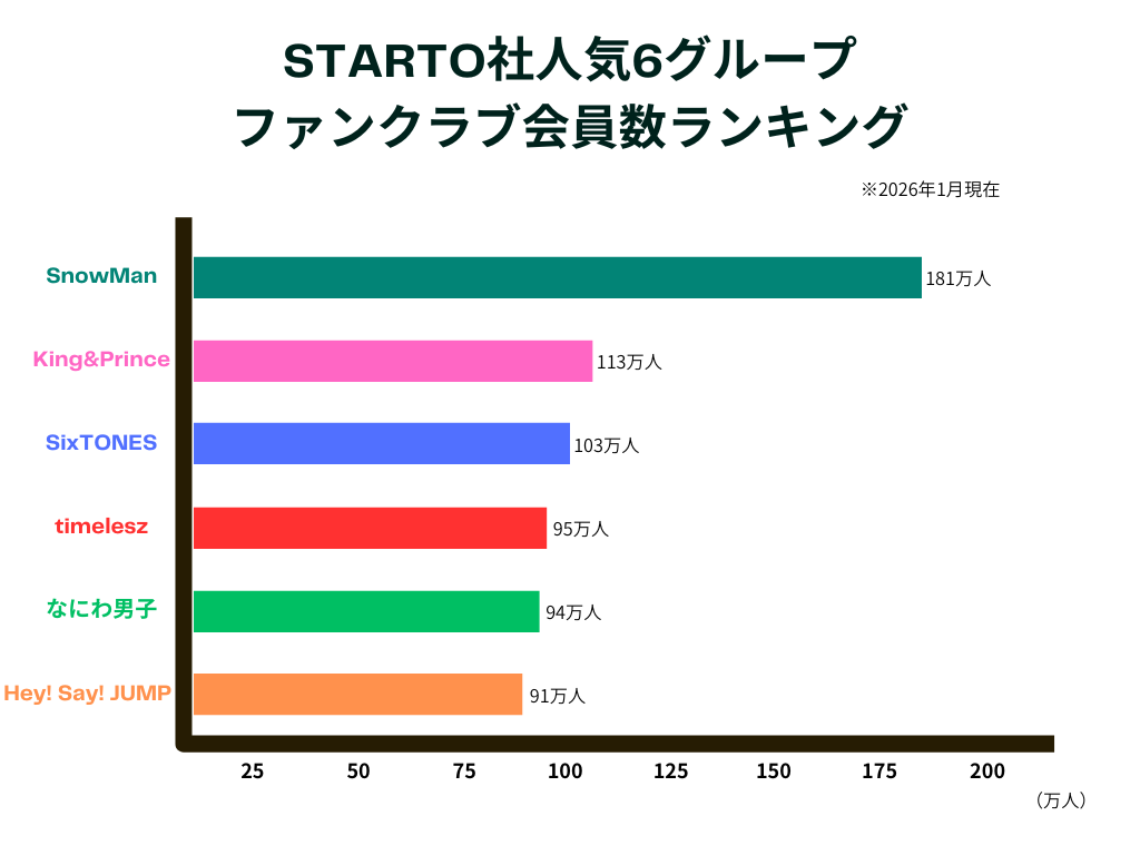 STARTO ENTERTAINMENT人気6グループの最新ファンクラブ会員数ランキング(2026年1月時点推計)です。