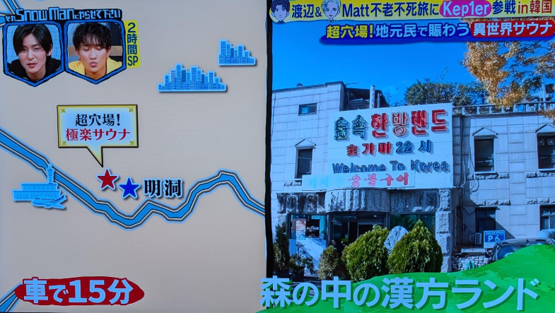 - 「それスノ」の韓国ロケ地は「高麗人参の山ロケ」、「最長7時間待ちの焼肉店」、「メディア初登場の極上エステ」、「超穴場サウナ」の4つが紹介される。