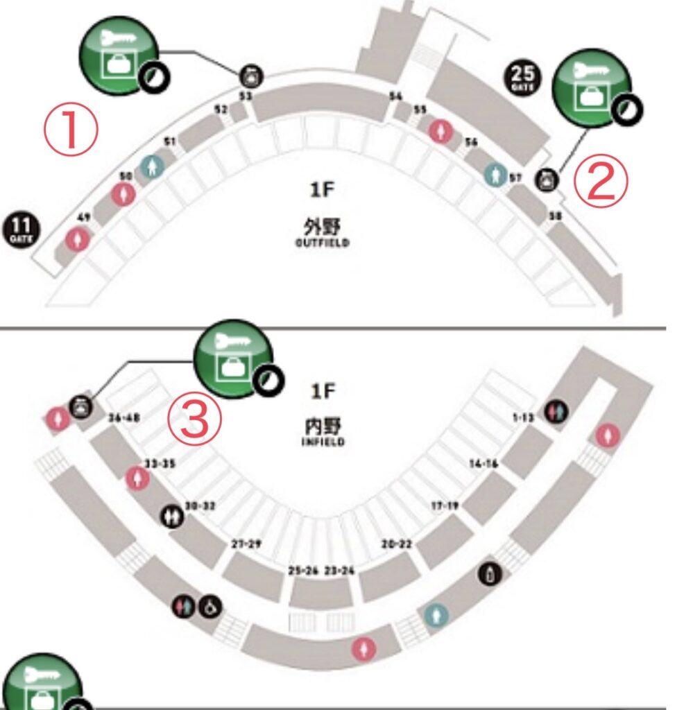 | ①外野コンコースレフト側53通路前 | 大2個・小11個 |