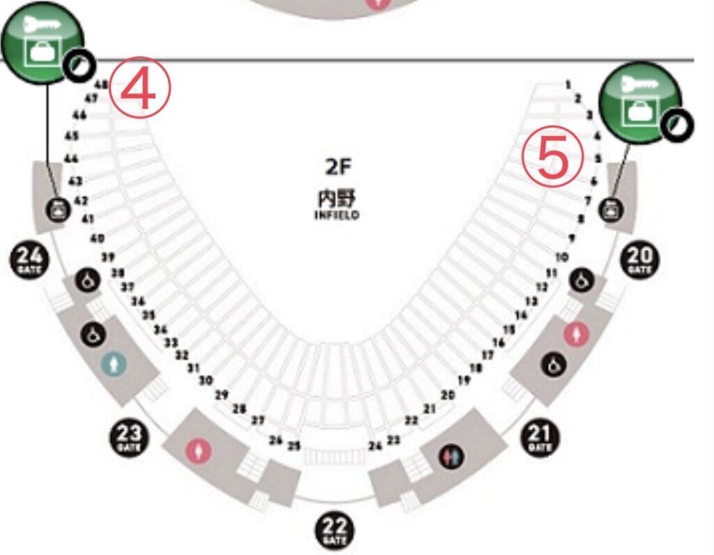 | ⑤2階コンコース1塁側20G横 | 大8個・小77個 |