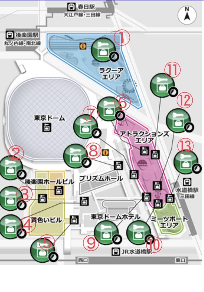 - 場所によっては施設の外にあるためドームシティ到着時直後から利用できる
